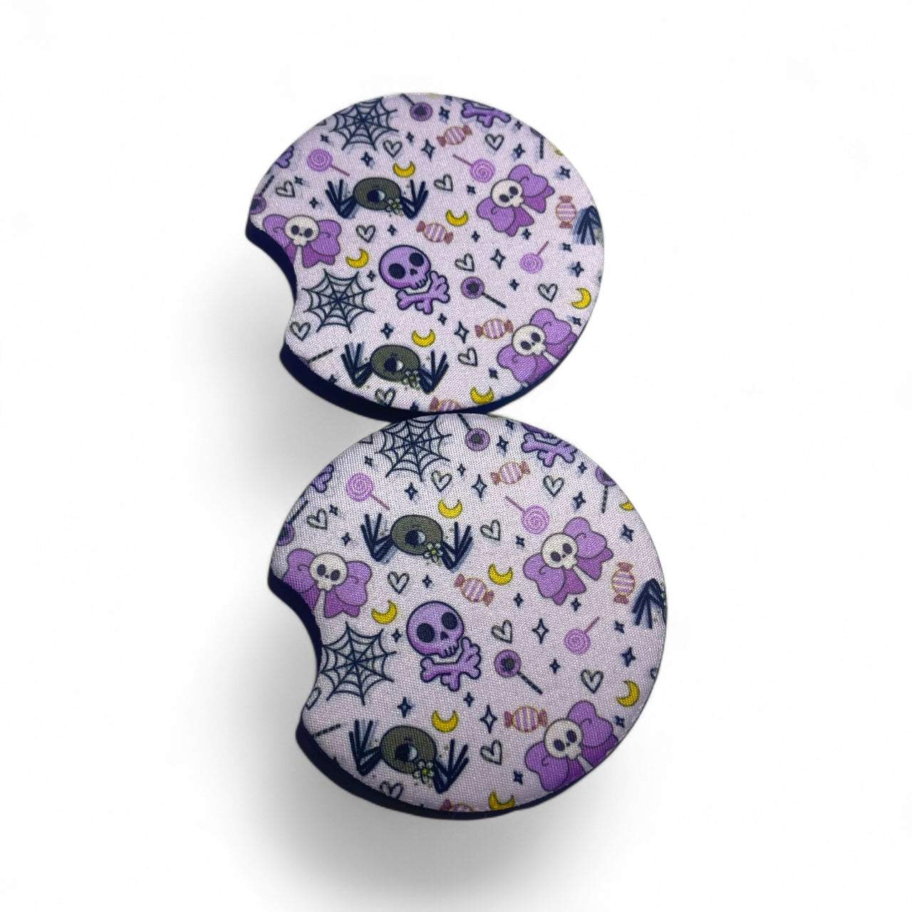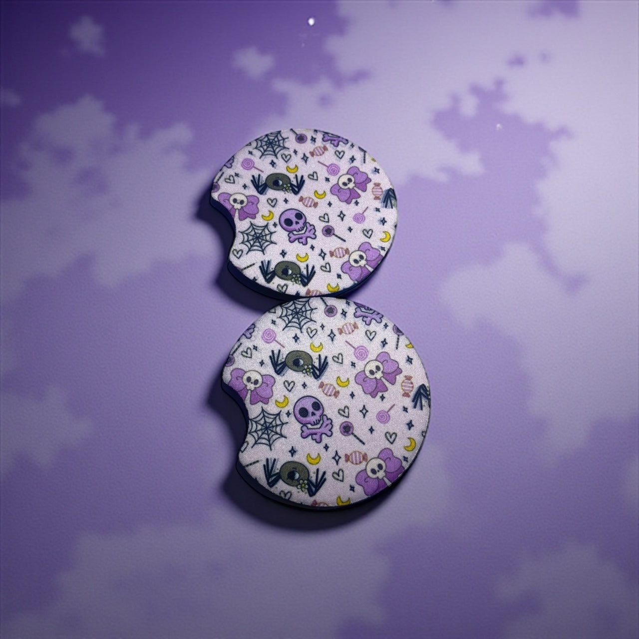 Add a playful ghoulish charm to your car with these adorable spooky-themed car coasters! Designed with pastel purple skulls, spider webs, moons, and candy details, they’re the perfect blend of creepy and cute — ideal for Halloween lovers or year-round spooky vibes.