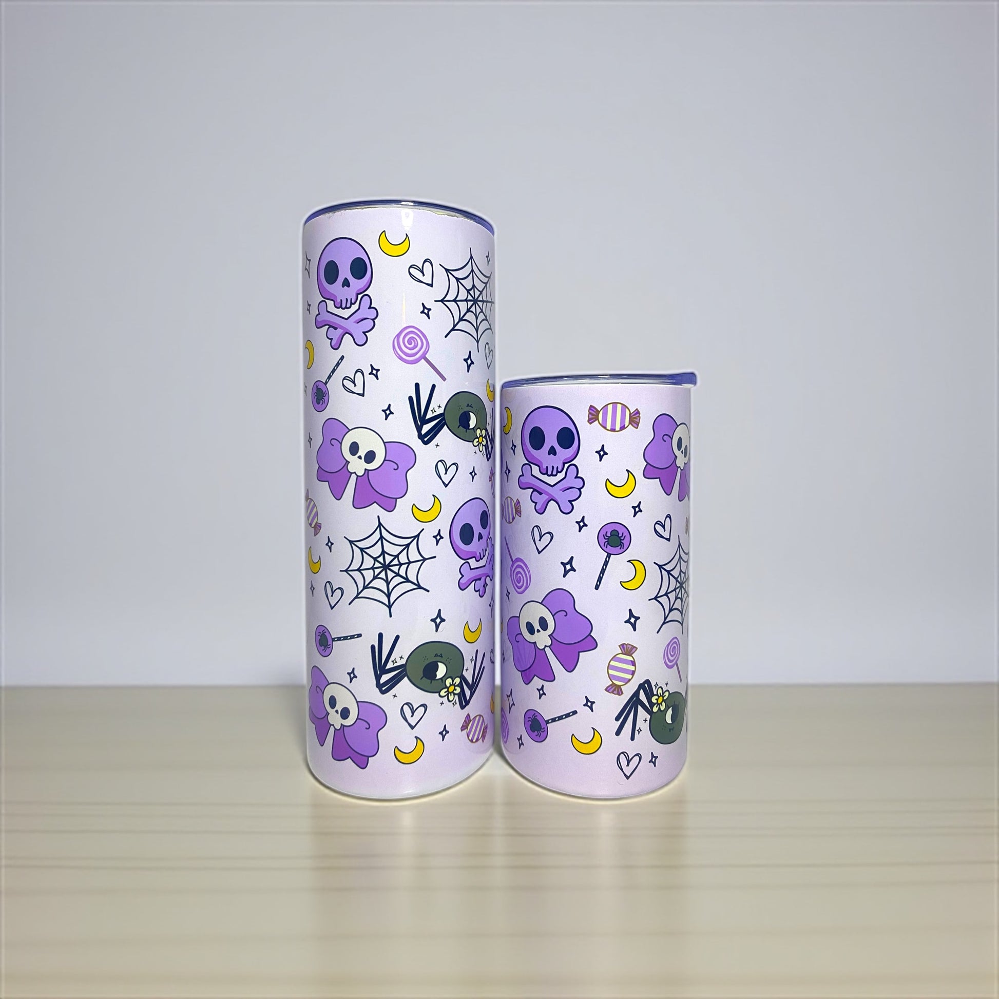 Add a touch of sweet and spooky charm to your drinkware collection with this Creepy Ghoul Tumbler! Featuring adorable skulls, spiders, candy, webs, and pastel purple bows, this tumbler perfectly blends cute and creepy for those who love Halloween all year round. Its soft lavender background and playful gothic design make it a must-have for any spooky aesthetic lover.