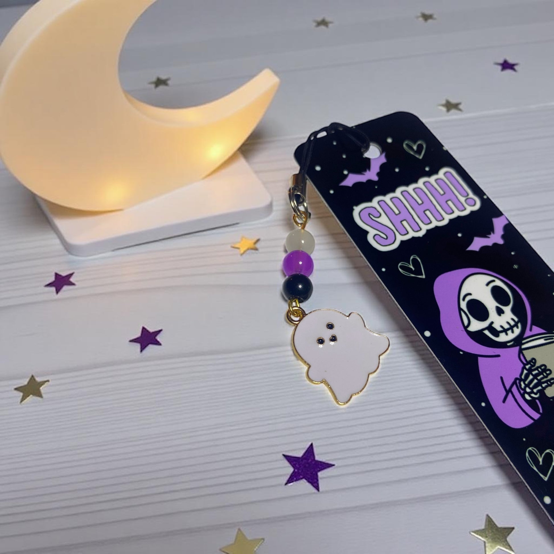 Each bookmark is double sided and comes with a matching beaded tassel and a dangling ghost charm — adding the perfect finishing touch for cozy fall reads or year-round ghostly vibes.