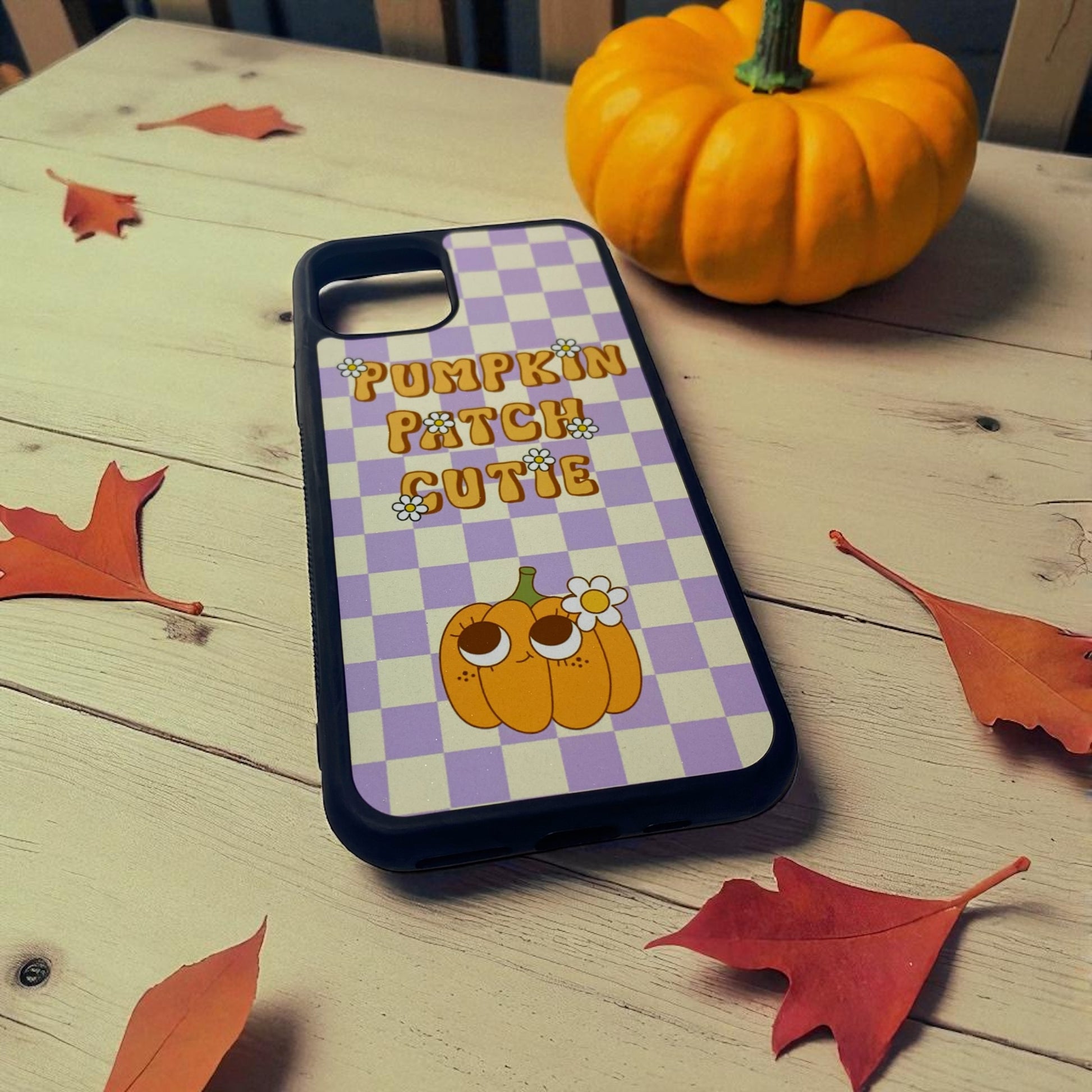 Pumpkin Patch Cutie phone case! Designed with a retro purple checkerboard background, playful daisy details, and the sweetest little pumpkin character, this case is the perfect accessory for autumn lovers, pumpkin patch adventures, and anyone who lives for spooky season.