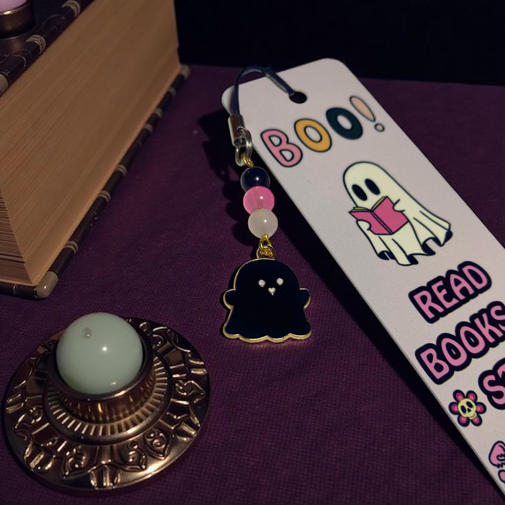 Each bookmark is double sided and comes with a matching beaded tassel and a dangling ghost charm — adding the perfect finishing touch for cozy fall reads or year-round ghostly vibes.